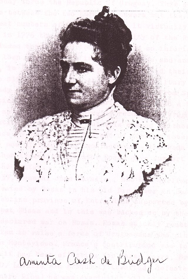 Aminta (Arminta) Ann CASH [Parents] [scrapbook] was born on 15 Jun 1848 in Mercedes, Buenos Aires, Argentina. She died on 30 Oct 1912 in Lomas De Zamora. Argentina.. She was buried in Llavallol Protestant Cemetery Argentina. Aminta married Robert BRIDGER on 20 Jan 1874 in Mercedes, Buenos Aires D, Argentina. |